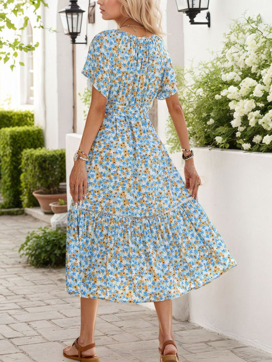 Midi Dress Floral Print Tie Neck Ruffle Hem